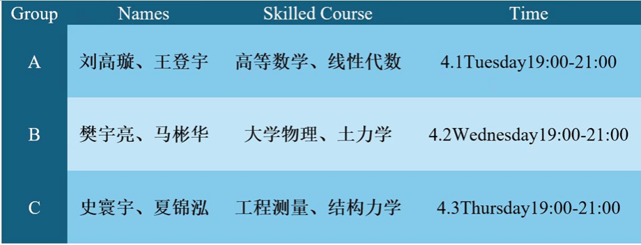 本次活动由6名跨学科优秀研究生组成教学团队,涵盖《高等数学》、《线性代数》、《大学物理》、《土力学》、《工程测量》、《结构力学》几门核心课程。教学团队成员不仅学术功底扎实,更具备丰富的教学经验,从知识答疑、方法指导、学业规划等维度为本科生提供了支持。活动采用“一对一+小组互助”的模式,针对学业难点、考试筹备等需求展开了个性化辅导。此外,教学团队还分享了考研心得、时间管理秘籍等实用干货,助力学弟学妹少走弯路。