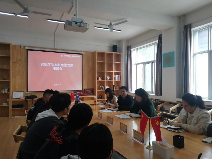 本科生党支部调研座谈会,本科生党支部书记张嘉雯、副书记赵宇晴,学院本科生党员代表、学生会主要干部参加了座谈会。同学们围绕党组织建设、党员教育管理、专业教学、英语教学等问题为学院建言献策,现场气氛热烈。同时,施书记也要求学生党员积极发挥先锋表率作用,为同学们办实事好事。