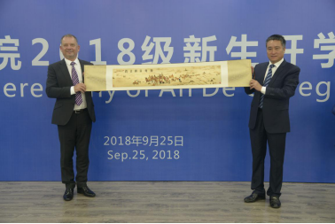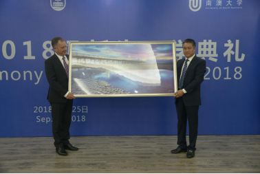 副校长牛荻涛与南澳大学副校长Allan Evans代表两校互赠礼物。