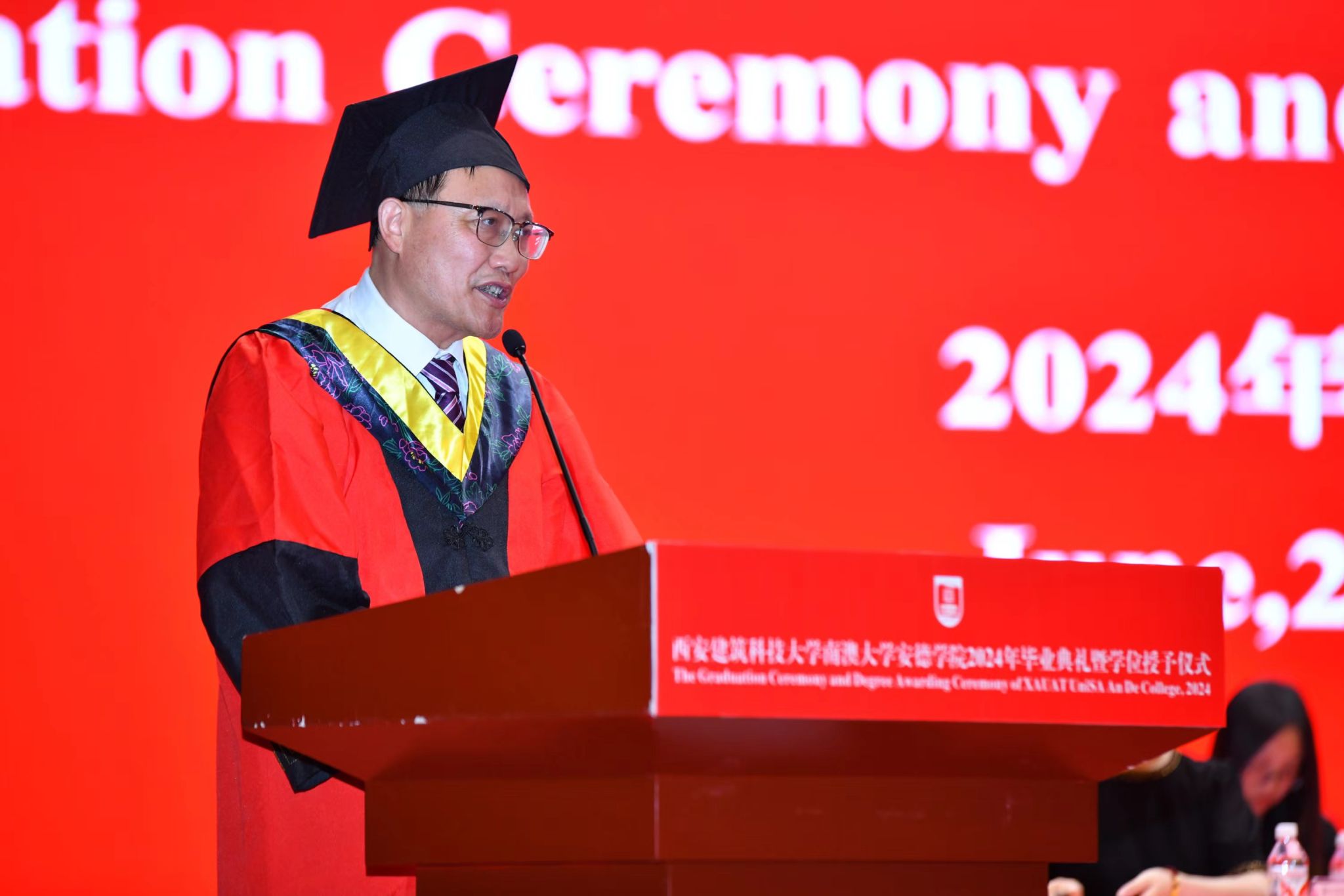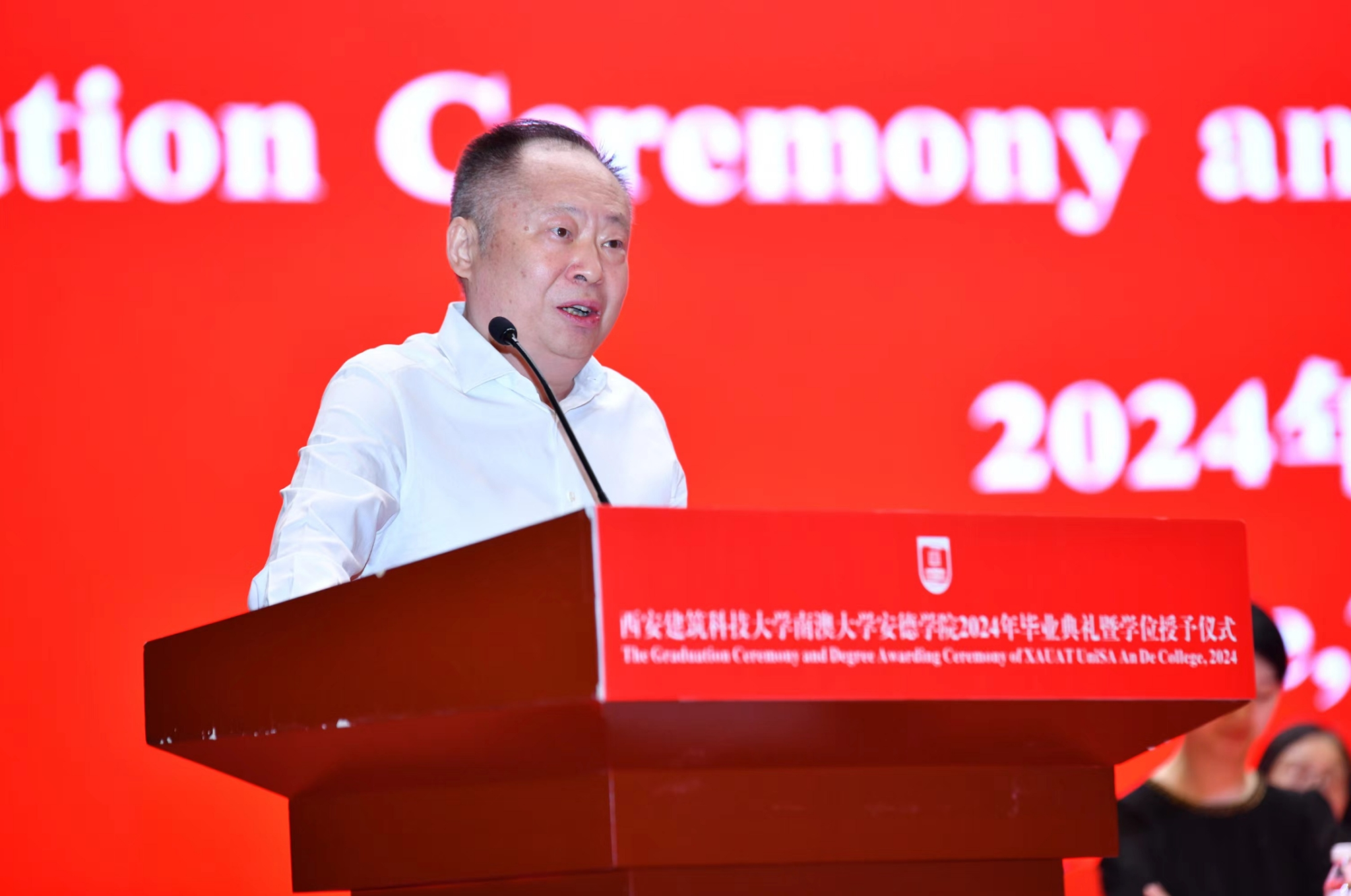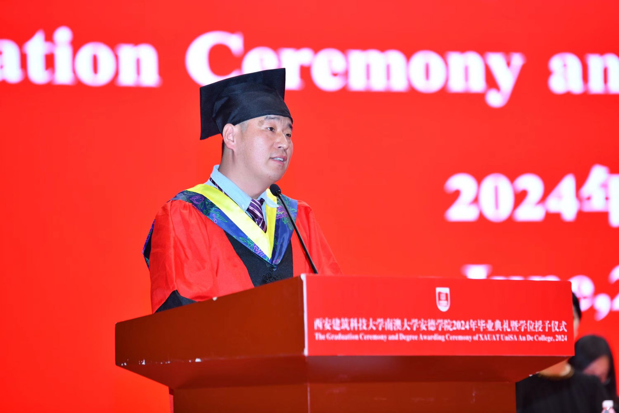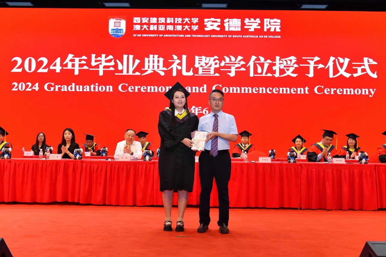 执行院长熊仲明向圆满完成学业的2024届毕业生致以热烈祝贺。他指出,安德学子以实际行动诠释了“开放创造奇迹,奋斗成就未来”的安德精神,为家长争了气,为安德争了光,为建大添了彩。熊仲明向全体毕业生提出三点希望:一是希望同学们乘风万里,心存鸿鹄之志。要将个人的理想追求融入党和国家事业之中,将自身的成长发展与民族伟大复兴紧密相连。二是希望同学们常怀远虑,保持斗志昂扬。要保持终身学习,努力扩展知识边界,不断探索新领域,为自己的未来创造无限可能。三是希望同学们保持热爱,坚守心中梦想。要盯准自己的目标,坚守梦想,在青春坡道上的砥砺前行。