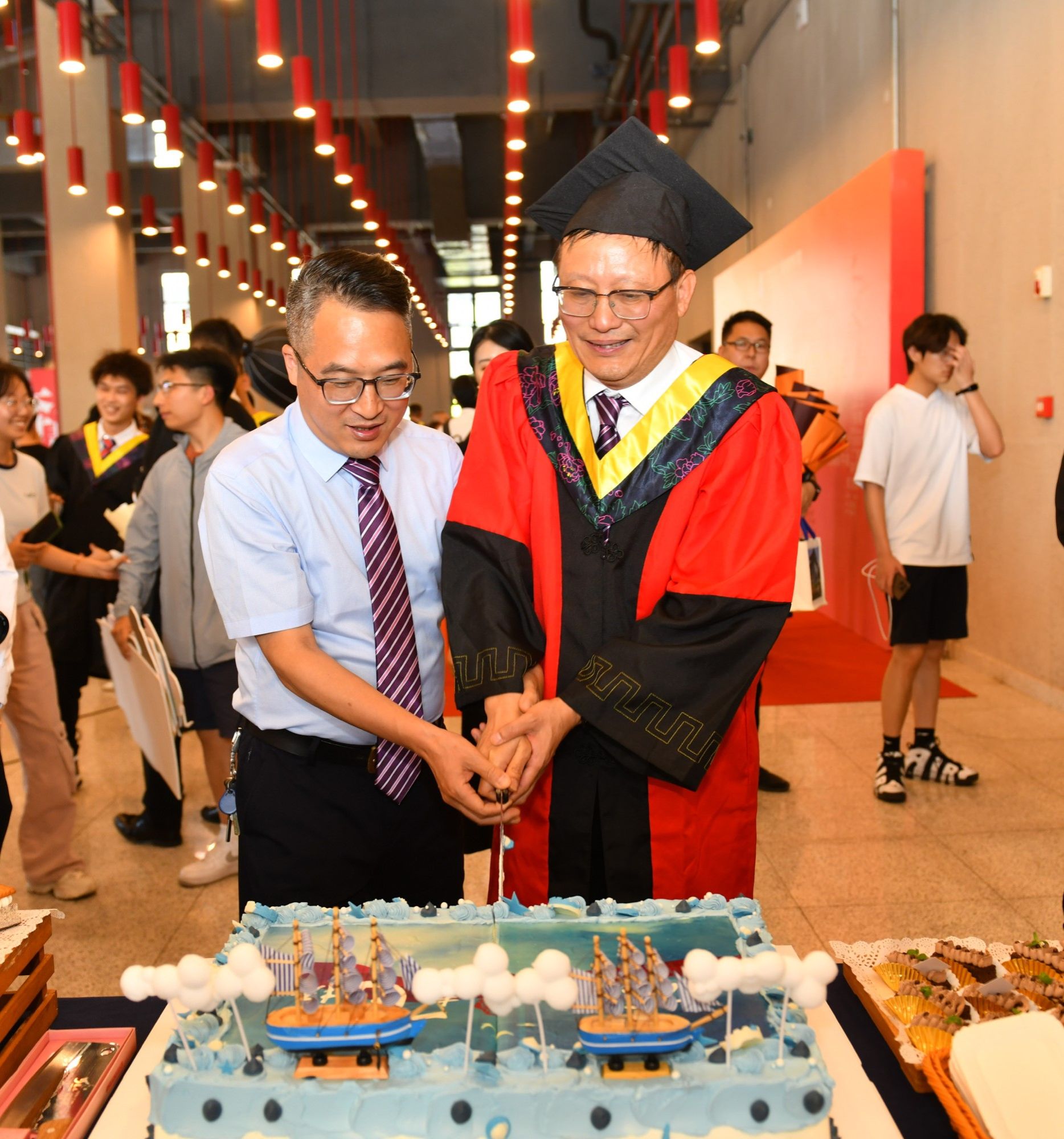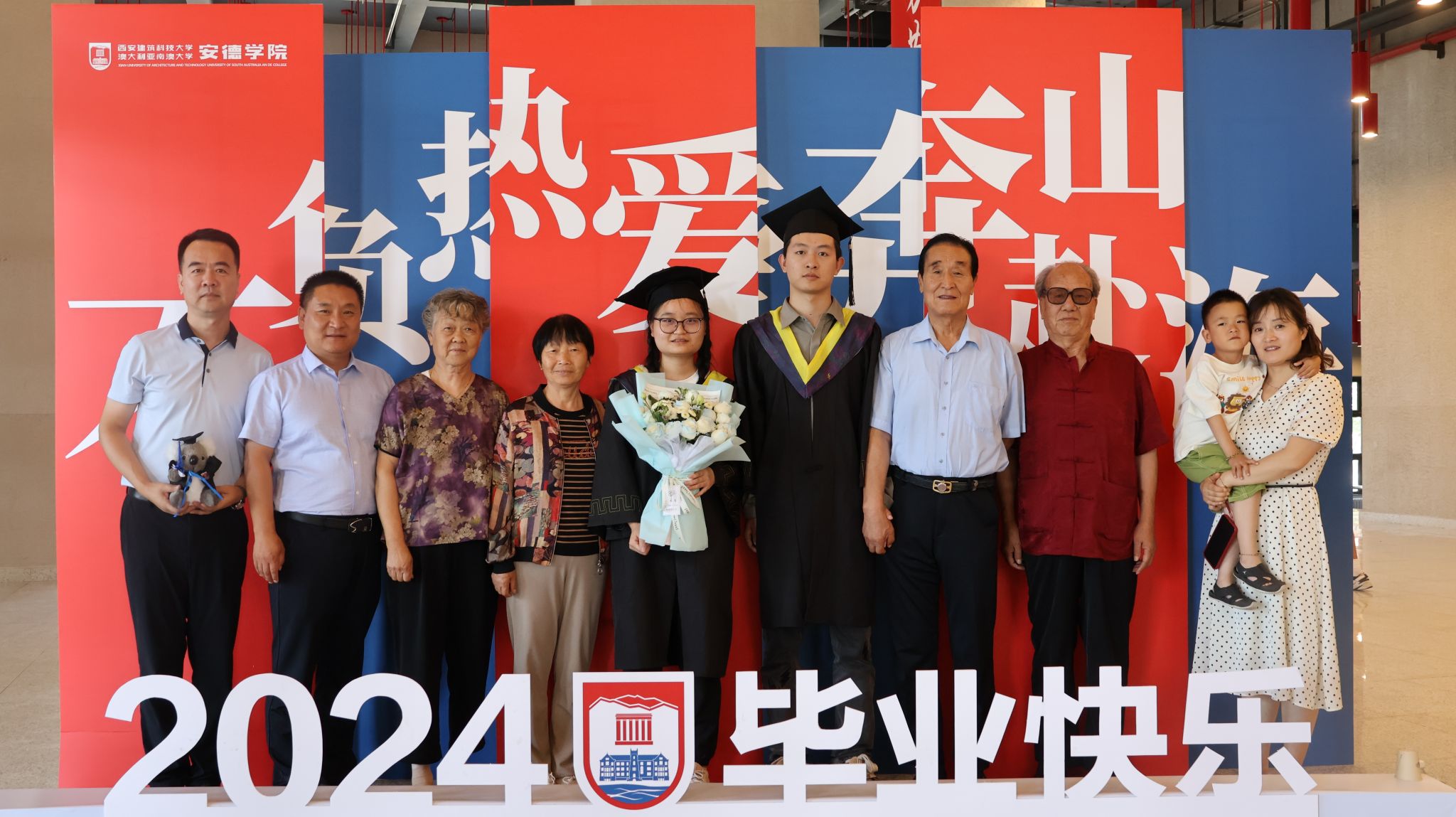 执行院长熊仲明、副院长赵蕾为2024届毕业生扶正流苏、颁发学位证书并合影留念。
