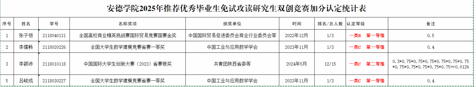 经过快猫短视频 2025年推荐优秀毕业生免试攻读研究生竞赛获奖专家审核小组审定,对参加推免学生相关奖项予以认定加分。