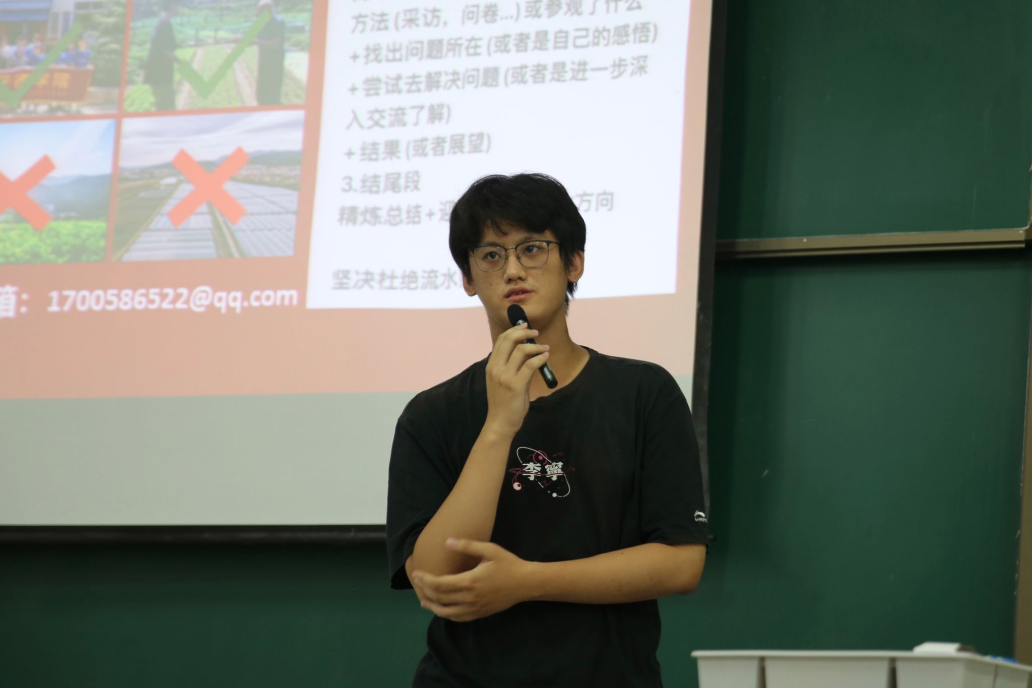 随后,团委宣传部部长王珍婷从确定申报主题到撰写调研报告等重要环节展开详细介绍。团委宣传部负责人石钟毓讲解三下乡记录、拍摄以及投稿要求,并针对实践流程进行说明。