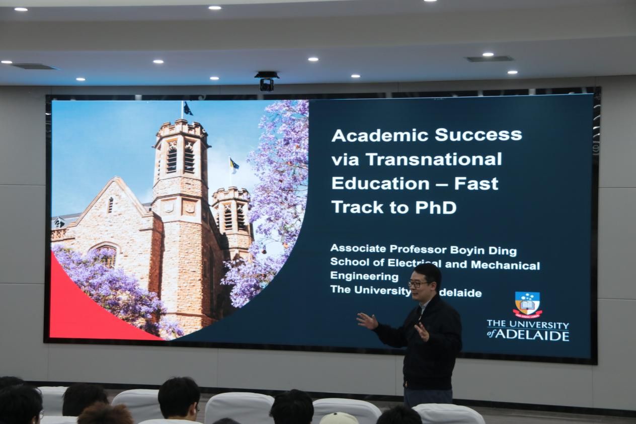 随后,Boyin Ding教授就“通过跨境教育实现学业成功——博士升学快捷途径”作主题讲座。他从自身的求学经历、研究方向出发,聚焦于跨境教育如何为学生提供更为广阔的学业发展机会,分享了多项阿德莱德大学博士升学的便捷途径案例,指出跨境教育不仅丰富了学生的学术经历,也提升了他们的全球竞争力。