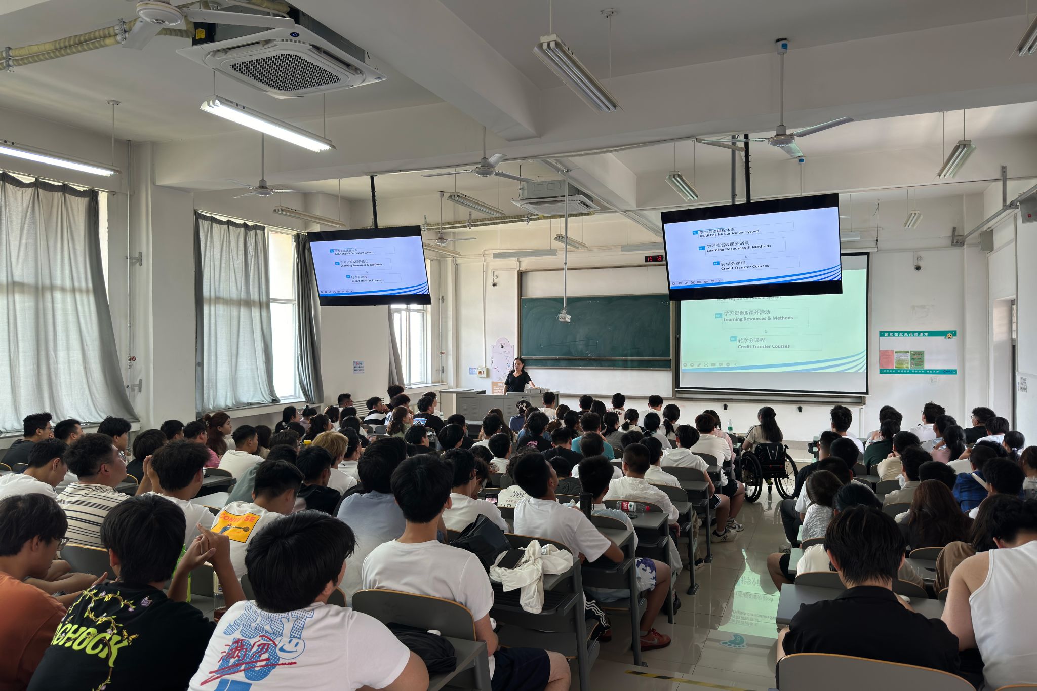 副院长赵蕾,教学办王军良、闫煜欣,AEMG英语教研组,各专业负责人以及2024级全体本科新生参会。