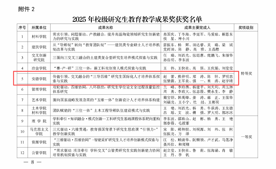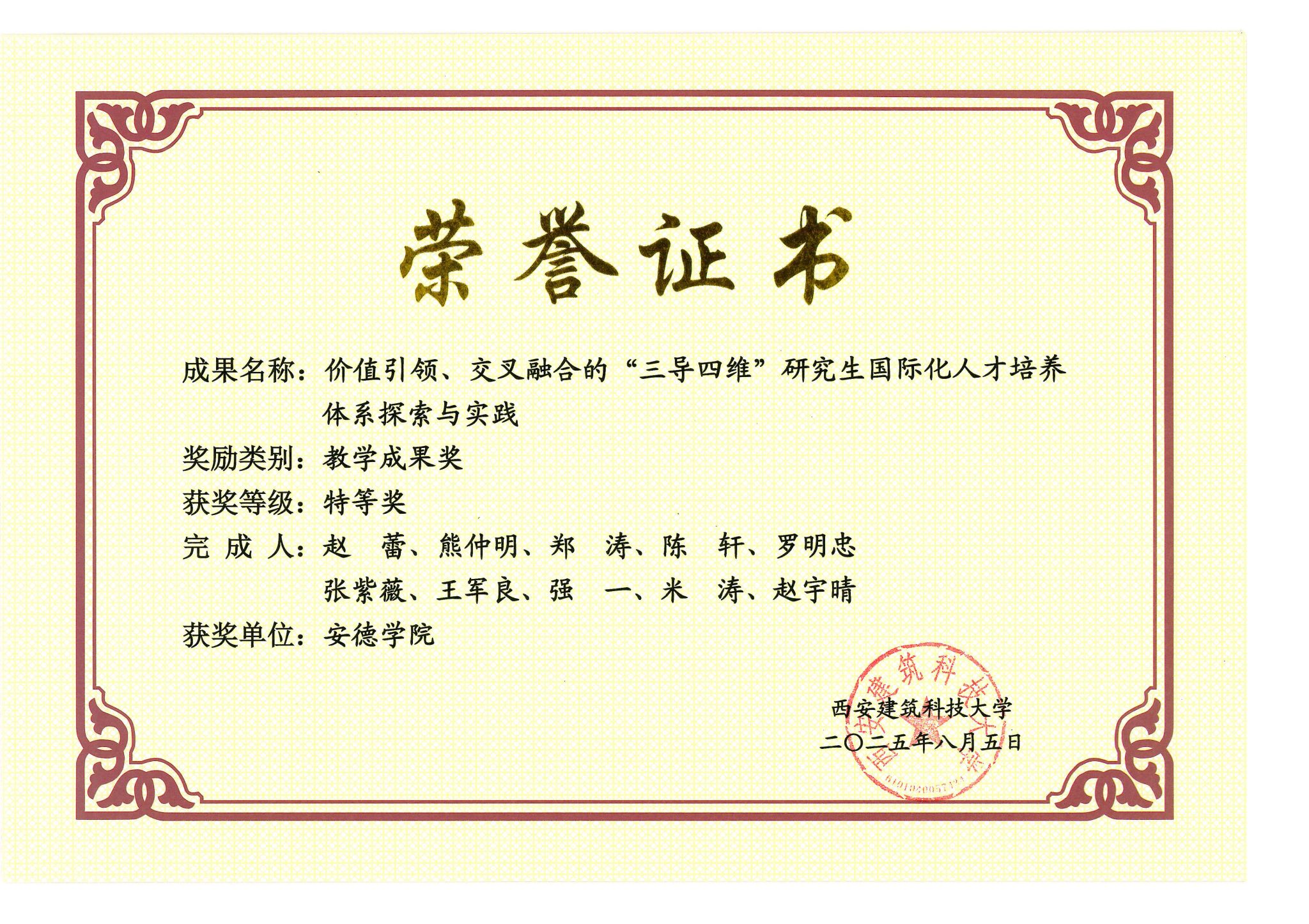 近日,快猫短视频 2025年校级教学成果奖评选结果揭晓。快猫短视频 申报的《价值引领、交叉融合的“三导四维”研究生国际化人才培养体系探索与实践》研究生教育教学成果,凭借其创新的育人理念、科学的体系构建与卓越的培养成效,从众多优秀项目中脱颖而出,荣获校级特等奖。这一重量级奖项,标志着快猫短视频 在拔尖创新人才培养改革上取得了突破性进展,为我校研究生教育高质量发展树立了标杆。
