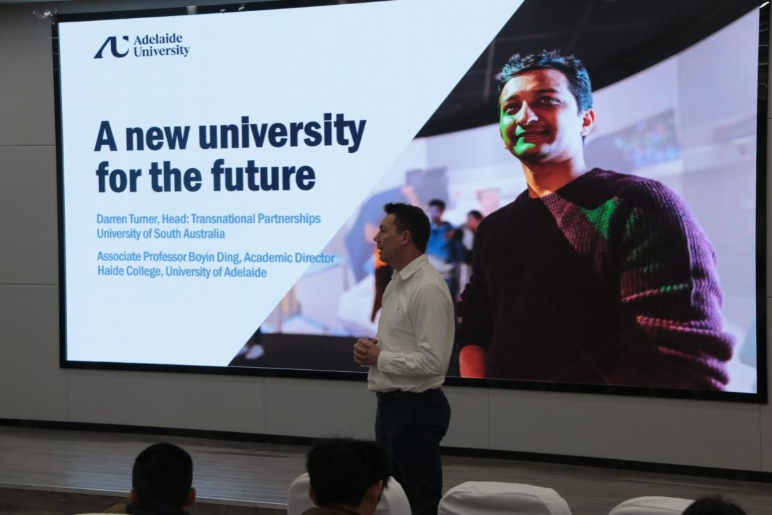 Darren Turner首先作主题为“新的阿德莱德大学,一所面向未来的大学”的分享,他详细介绍了由南澳大学与阿德莱德大学即将合并为的阿德莱德大学(Adelaide University)在教育创新、科研前沿、就业实践及国际合作方面的最新进展。他强调,阿德莱德大学致力于为学生提供一个充满活力的学习环境,以适应全球化时代的需求。